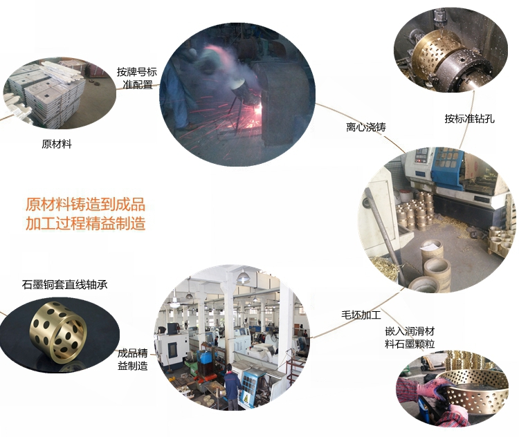 我們根據(jù)使用工況和環(huán)境要求,選擇不同的銅合金材料,如大氣環(huán)境選擇高力黃銅為基體;水環(huán)境下一般選用錫青銅為基體;高溫或海水腐蝕等工作環(huán)境選用鋁青銅為基體;其他特殊工況環(huán)境選擇相應(yīng)的銅合金材料為基體;然后根據(jù)產(chǎn)品的實(shí)際受力情況和運(yùn)動(dòng)方式,確定潤(rùn)滑劑的排布方式和密度,以求達(dá)到最佳使用效果和壽命。 銅石墨軸承使用廣泛,如冶金機(jī)械,工程機(jī)械,注塑機(jī)械,水利機(jī)械,海工裝備,風(fēng)電設(shè)備,模具行業(yè),印刷包裝機(jī)械,礦山設(shè)備,石油化工機(jī)械,各種輕工機(jī)械等等。
