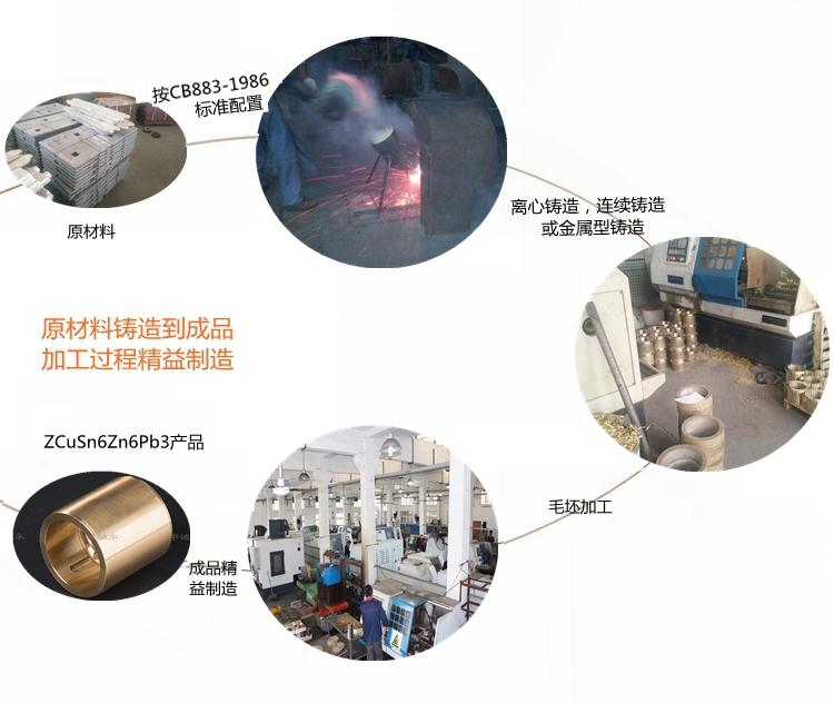 本產(chǎn)品實(shí)行CB883-1986標(biāo)準(zhǔn)………………………………………… 根據(jù)客戶產(chǎn)品需求我們提供的鑄造方式有:離心鑄造,連續(xù)鑄造和金屬型鑄造。…………………………………………………………… 牌號(hào)ZCuSn6Zn6Pb3合金銅化學(xué)成分:Cu余量 Sn5-7 Pb2-4 Zn5-7 Fe0.4 Al0.05 Si0.05 Sb0.3 P0.05